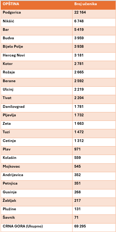 Od ukupno 69.295 osnovaca u Crnoj Gori, skoro trećina upisana je u škole u Podgorici. Podaci Uprave za statistiku za ovu školsku godinu potvrđuju veliki jaz između opština – glavni grad prednjači sa 22.164 učenika, dok u klupama šavničkih osnovnih škola sjedi svega 71 đak.